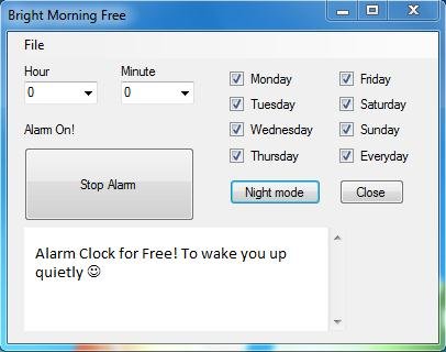 Bright Morning Free is a nice desktop alarm clock for Windows that wakes you up by playing your favorite songs as the alarm sound. It lets you set alarm for each day of the week, plus it works in both day and night mode. The only thing I found missing is that you can not define the alarm time in hours and minutes on your own. First alarm is already set for you; you can just postpone the time by adding hours and minutes to it.