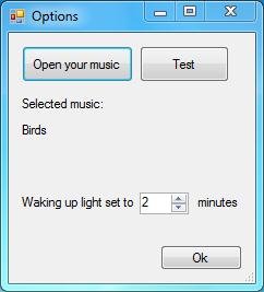 For this, just go to the “File” menu and choose “Options” menu item. This will open the Options window, which allows you to browse a music file from your system and attach it to this free desktop alarm clock. You can also test play the music file. Only MP3 files are supported. And apart from that, you can also set the time period here, for which the waking light will glow in night mode.