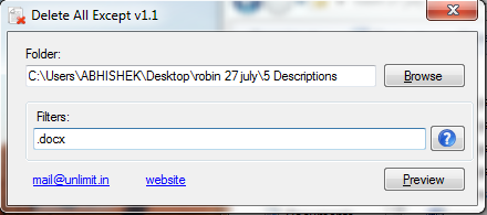 After you launch this free bulk file cleaner you would see a very simple interface with very few options on it. The window is a small one which has two blank spaces each representing the Folder location and the filters respectively. To begin with you need to be aware of the folder where you wish to delete specific bunch of files from. You need to be cautious enough about the location before you proceed to select the specific folder. The reason for this is that you might accidentally end up deleting all the files even the ones which you would have not liked to be deleted.