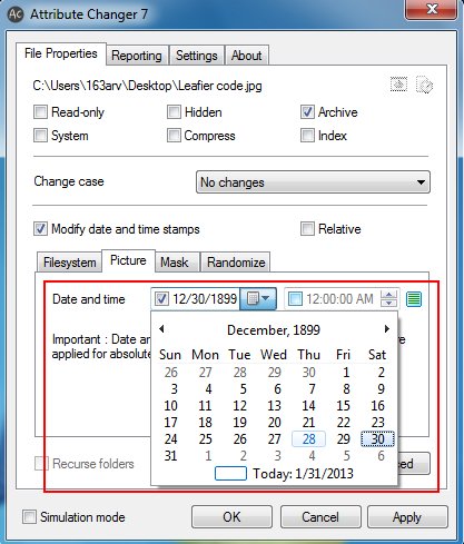Attribute Changer is a nice software that allows you to quickly change properties of different files and folders (including pictures) on your system. It can be used to change the time stamps, dates, and other standard attributes like hidden, read-only, archive, etc.