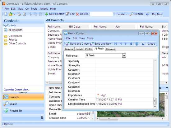 The application is designed keeping in mind that you may have unlimited contacts to store for practical purposes. You can easily add birthday and anniversaries to a contact and the program has in built reminder that will remind you of dates on time, so you need not use any extra software for remembering these dates. There are custom fields that fully meet your special business requirements. This application helps you to save your time by offering you features such as flash find, fast input of contacts from the same company, copy and paste of contacts as well as bulk import.