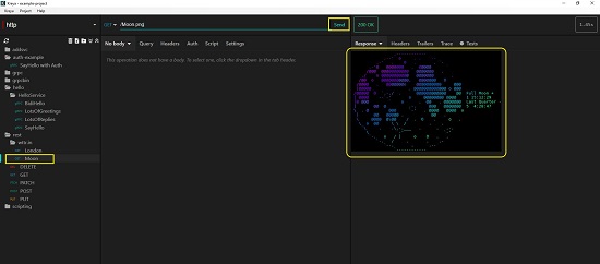 6. Click on ‘Moon’ under the same wttr.in folder and then click on ‘Send’ and you will get a PNG image of the Moon showing the current phase. This demonstrates that you have successfully added the wttr.in Rest API.