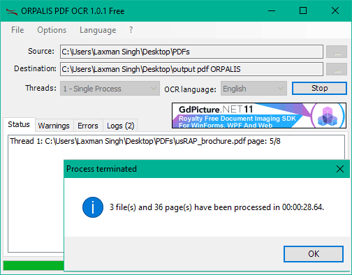 The software also supports multithreading to process multiple pages of PDF files together. Apart from that, this software supports multiple OCR languages: English, German, Italian, French, and Spanish. So, if your scanned PDF is in any of these languages, it can make it a searchable PDF. All you need to do is select the OCR language and press Start button.