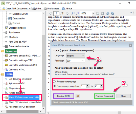 Bytescout PDF Multitool is one of my favorite software to convert scanned PDF to searchable PDF. The software is very simple but can process one scanned PDF at a time. The conversion speed is really good.