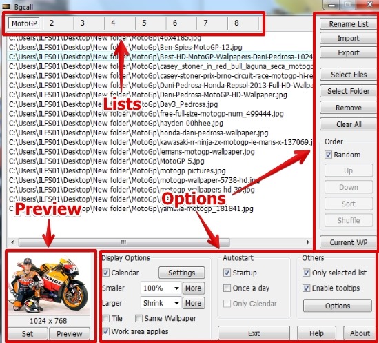 Bgcall lets you create 8 different lists of wallpapers for desktop. You can add or remove wallpapers in the list and simply select the list from which you want the desktop wallpapers. You can add as many wallpapers in the list as you want.