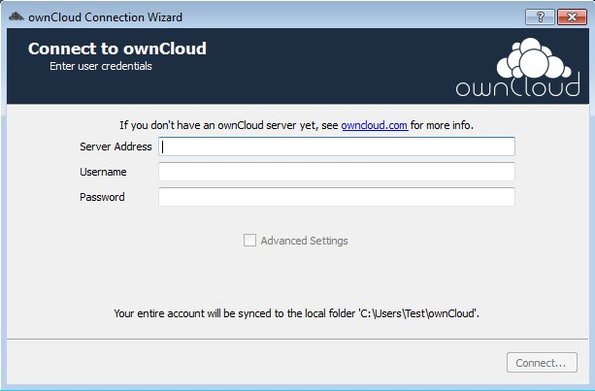 When you run the desktop client you’re gonna have to type in the address of the cloud storage, then username and password that you’ve used. Click Connect and you’ll be able to upload, access and sync files to the created cloud storage.