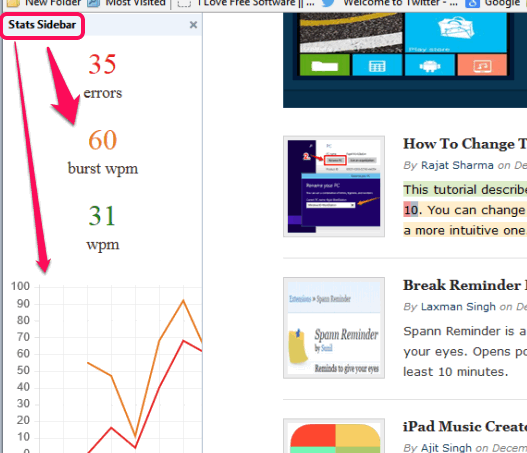 Apart from this interesting feature, it also provides a stats sidebar on left side of webpage. In that stats sidebar, it provides errors, burst wpm, and correct words per minute in real-time. You can also see the graph that measures speed in real-time.