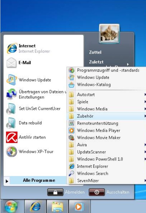Image above shows us Start Menu of Windows XP after it has been converted to Window 7 style. Notice that when it comes to appearance the menu as well as the panel down below are practically identical to Windows 7, but there are small differences. Look at the menu, All Programs are opened on the side, instead of collapsing within the left portion of the Start Menu. Same thing is true for pretty much every other aspect of the system.