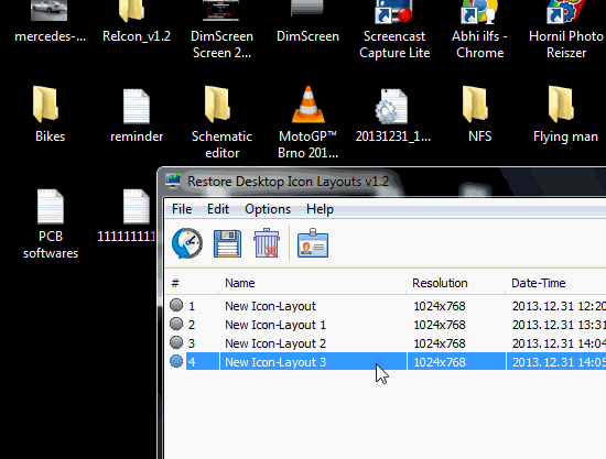 I have tested ReIcon in Windows 7 and it worked really well for me to manage desktop icons. I was able to restore my desktop icons all in one single click. Below I have posted a screenshot in which you can see the different desktop icon layout saves.