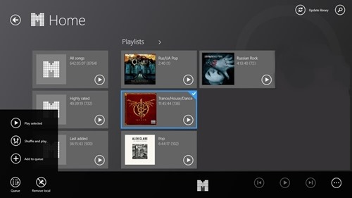 The home screen of the app will look like the above window where you can see the control bar at the bottom of the screen. You can select a playlist by right clicking it. After you have right clicked, you can select the Queue options from the bottom of the screen, like Play selected, Shuffle and Play, Add to queue. The Queue menu is opened in the above screenshot.