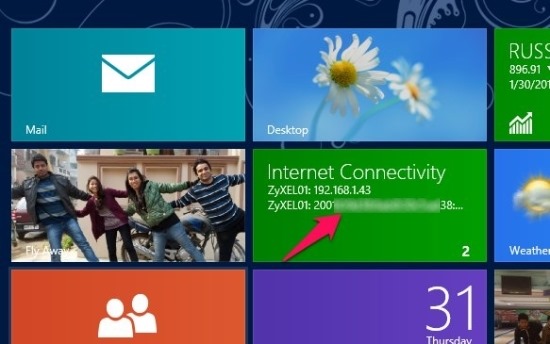 - Now just go back to the start screen and the live tile will display your IP address and the MAC address in front of you always, as shown in the first screenshot of this post.