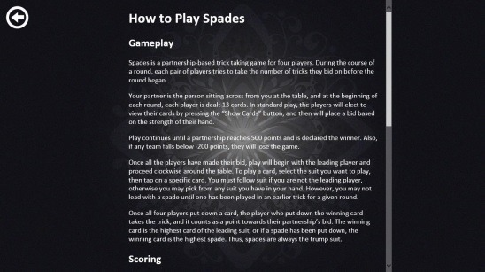 One good feature of the app is that it tells all the rules and regulations of “How to play Spades” within the app itself. Plus it also tells the scoring rules. It is a good idea to quickly go through all of these, before you start playing. Besides these, the app also shows you the game stats, such as: total games played, total games won-lose, total points earned, total tricks played etc.