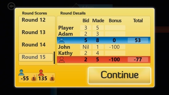 The gameplay of the app is excellent. You’ll get three more players besides yourself. These are basically computer generated players. The one who’s in front of you is your team mate. Each play gets 13 random cards from different suits at the beginning of each round. Before you make a card deal (show the first card), you have to make a bid. The app gives you options to either view all the cards before you bid, or bid without viewing the cards, which is called “BLIND”. One good advantage of this options is: if you are able to achieve the bid number, then the app will award you with heavy bonuses. Now the beauty of this game is, the higher the bid, the more points you can score (provided they are met). If you aren’t able to meet the bid then there are penalties in form of negative scoring. Also there are penalties for bidding too low!
