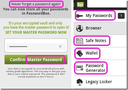 →PasswordBox is free password manager app for Android to save passwords and important data like passport, credit card details, with a safe master password.