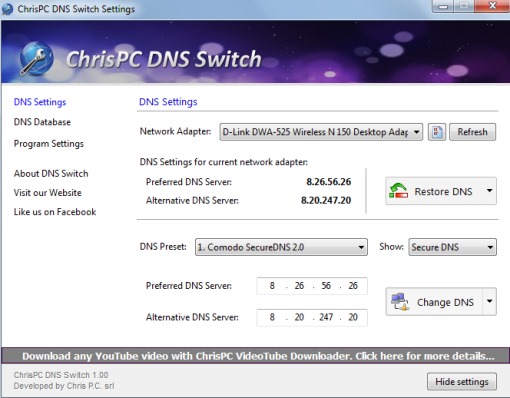 ChrisPC DNS Switch helps to change DNS server for network adapter. It provides list of DNS servers to choose from, for safe Internet browsing.