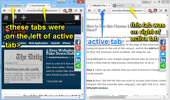 Tab Scissors is a free Google Chrome extension to view tabs in multiple windows. It splits the browser window into two from currently active reference tab.