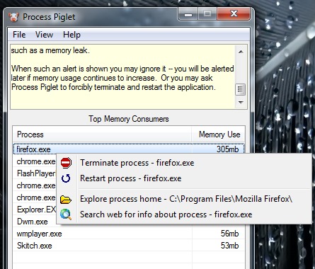 Process Piglet is a process monitor software to monitor memory use of running processes. It give alerts when a process starts consuming additional memory.